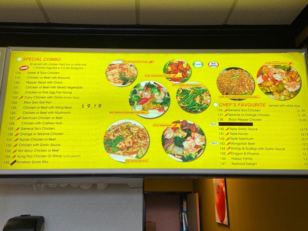 Hunan beef, cantonese chicken chow mein, chicken with cashew nuts, General Tso's chicken, 4-piece egg rolls or 8-piece crab Rangoons, and chicken fried rice.
